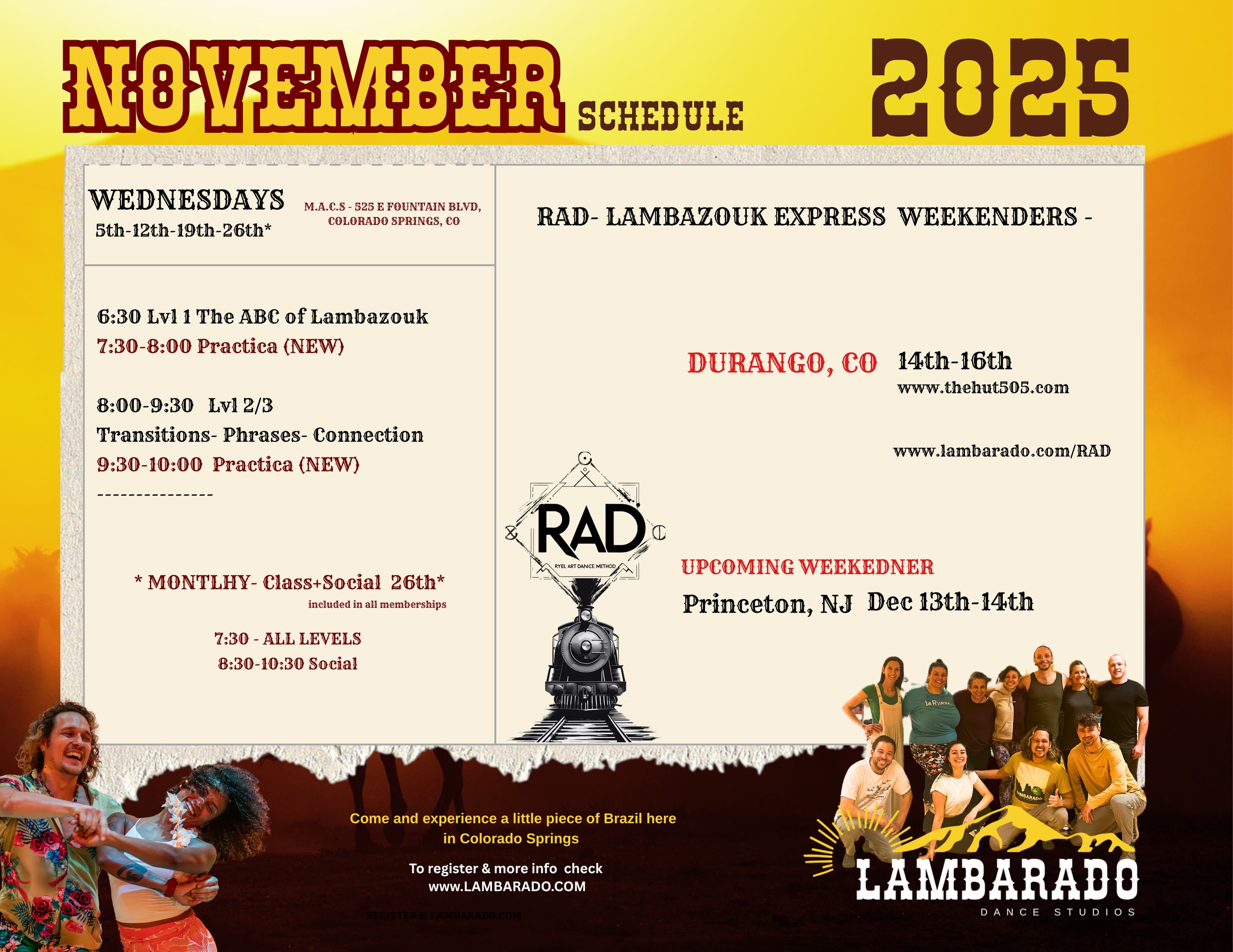 Welcome to Lambarado Dance Studios, the home of the RAD (Ry’el Art Dance) Method for Lambazouk. Founded by international instructor and choreographer Ry’el Located in Colorado Springs, Lambarado is a creative space where beginners and experienced dancers alike discover confidence, connection, and flow through the Joyful languages of Lambada and Brazilian Zouk combined.