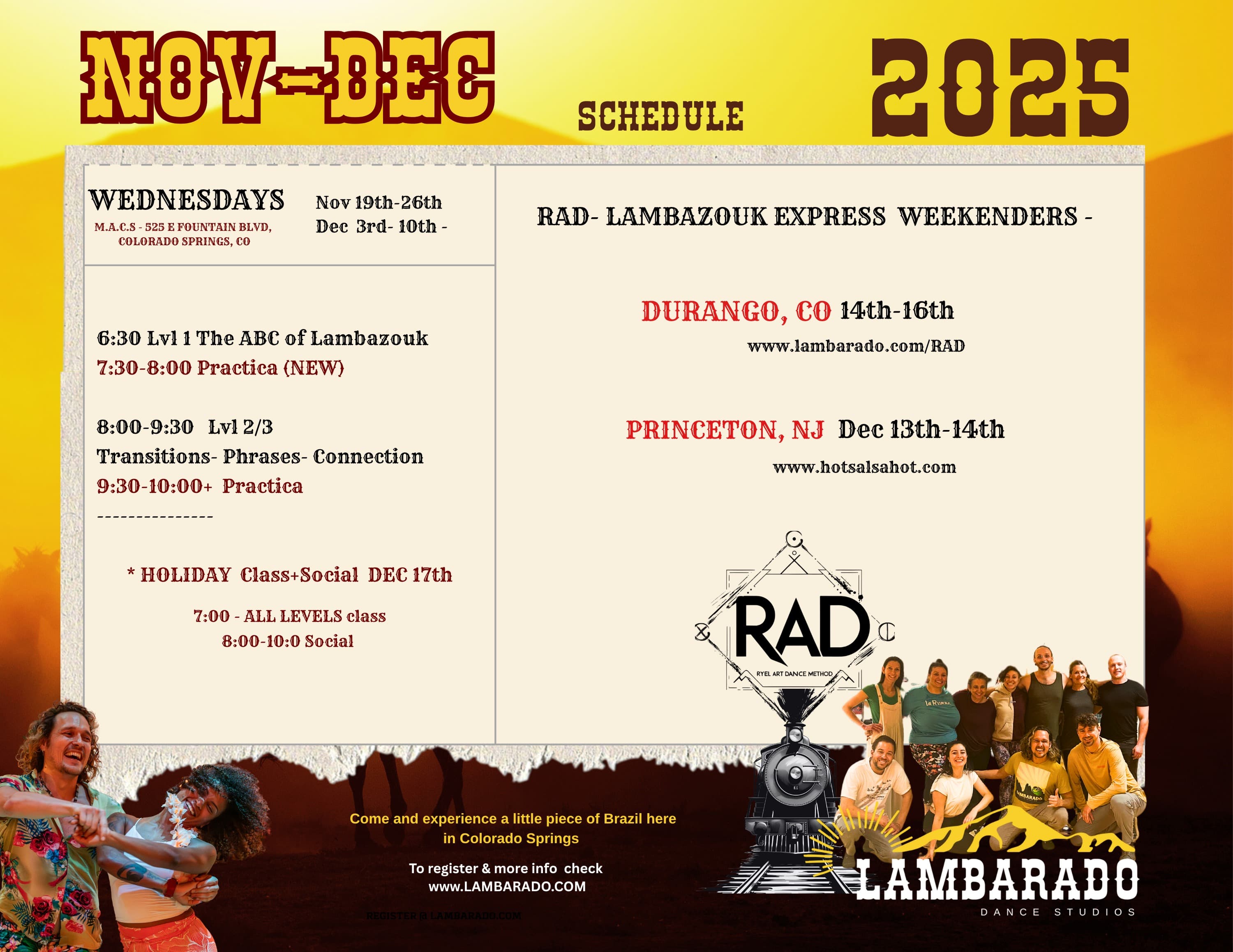 Welcome to Lambarado Dance Studios, the home of the RAD (Ry’el Art Dance) Method for Lambazouk. Founded by international instructor and choreographer Ry’el Located in Colorado Springs, Lambarado is a creative space where beginners and experienced dancers alike discover confidence, connection, and flow through the Joyful languages of Lambada and Brazilian Zouk combined.
