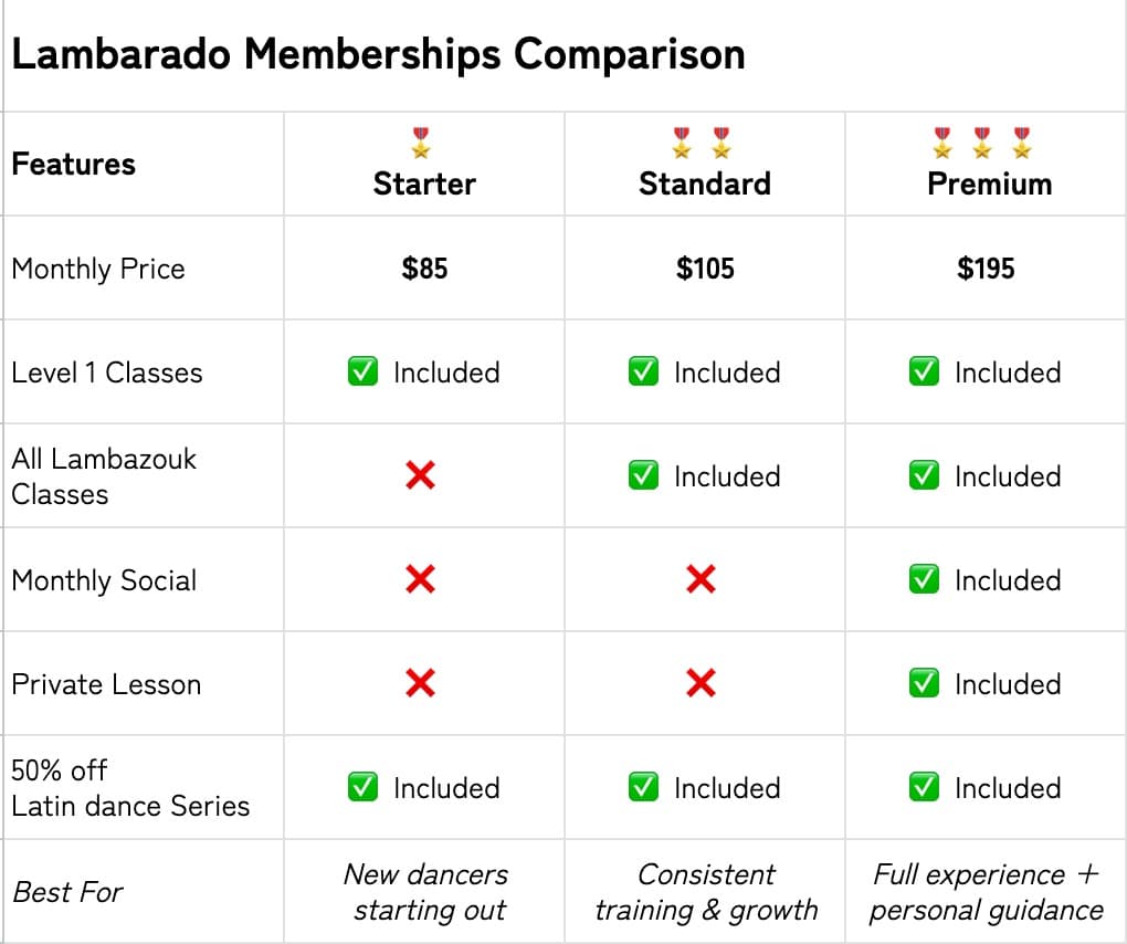 - Start with STARTER are if you’re brand new - Choose STANDARD if you want to train consistently - Go Full Access for the complete experience and personal guidance.