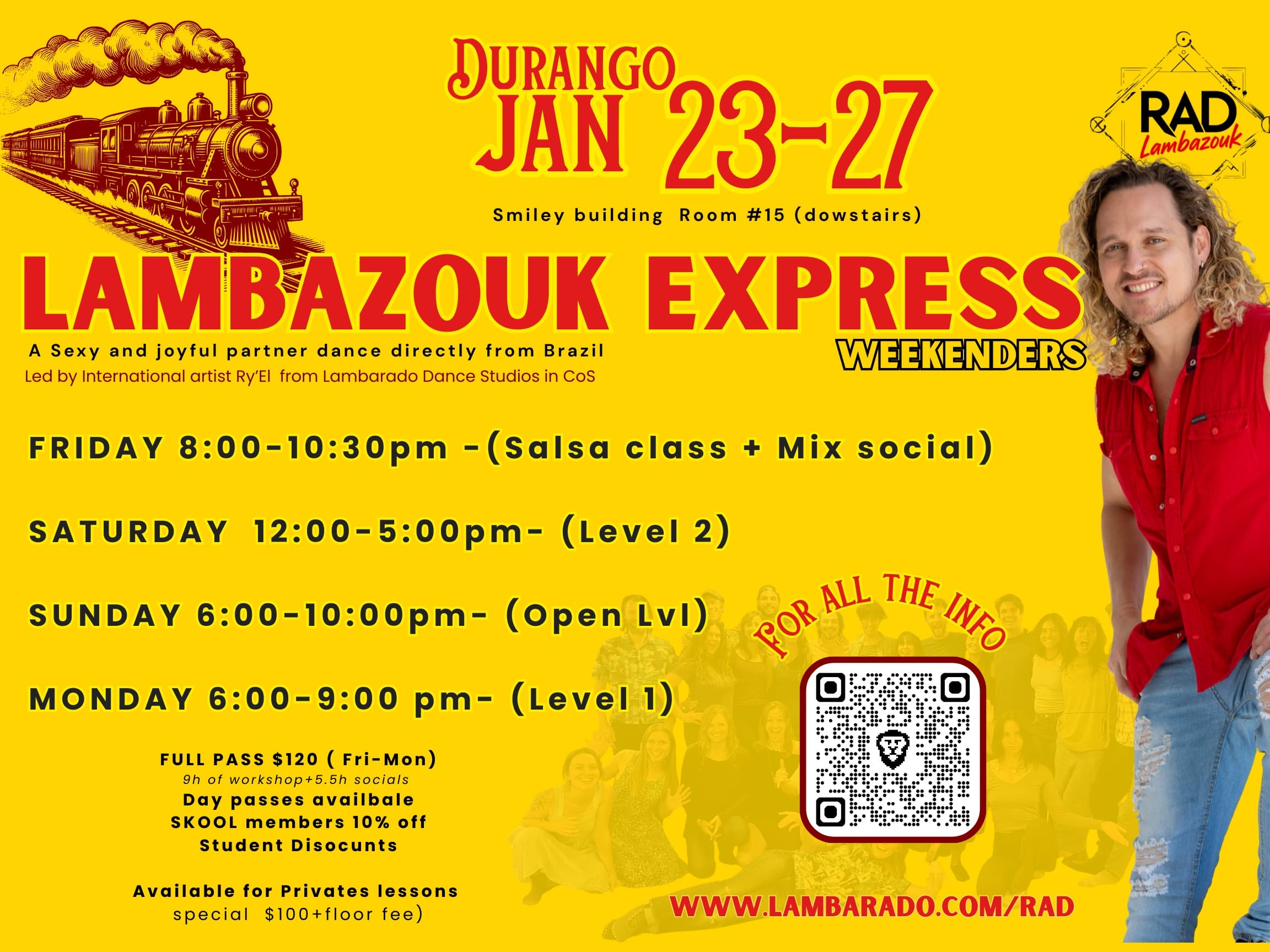 Join us for the 3rd edition of the RAD Method Weekenders! 🚂 Jump aboard the LAMBAZOUK Express in Durango and become part of the first wave of Lambazouk dancers on the Western Slope!
